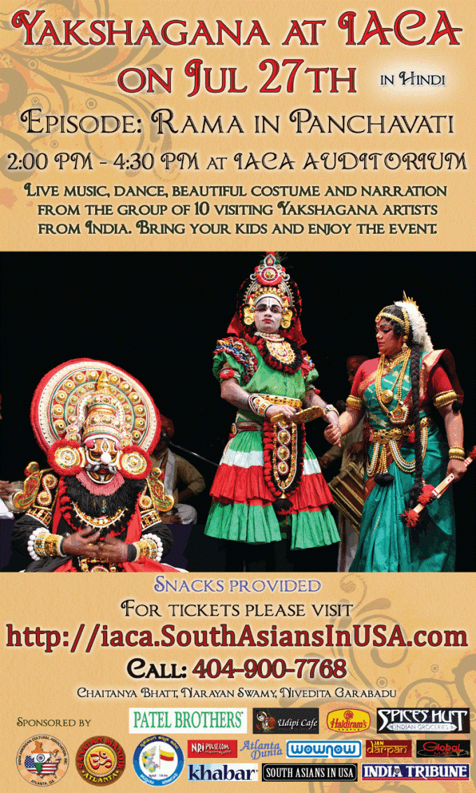 Theatre and Indian culture enthusiasts can now enjoy two Yakshagana performances (in Hindi and Kannada) by the traveling troupe Yaksha Manujsha, in Atlanta. Hosted by India America Cultural Association (IACA), the Hindi performance will be held at the IACA Auditorium on July 27th at 2:00 pm ( www.iacaatl.org for more details). The Kannada performance will be hosted by Nrupathunga Kannada Koota (NKK) on the previous day (July 26th) at the Hindu Temple of Riverdale at 4.00 pm (visit www.atlantakannada.org)