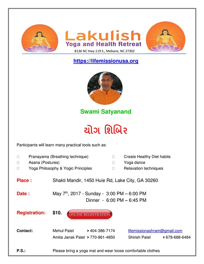 Organized by Lakulish Yoga & Health Retreat, 8136 NC Hwy. 119 S., Mebane, NC 27302