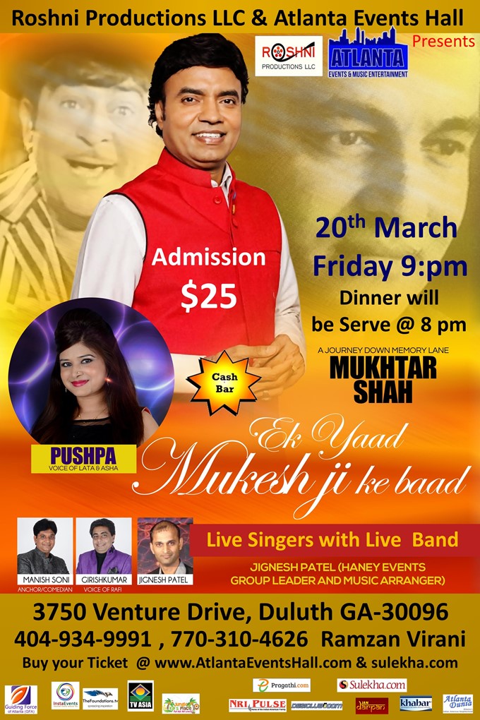 Tickets: AtlantaEventsHall.com and Sulekha.com, https://allevents.in/duluth/ek-yaad-mukeshji-ke-baad-atlanta-events-hall-in-usa/614032142062232.