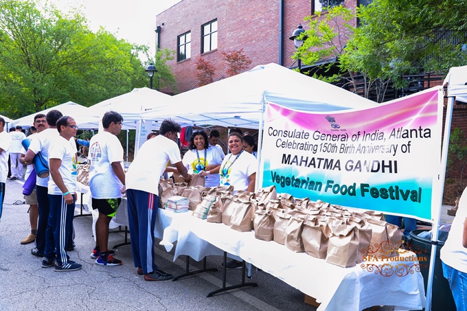 At a booth near the entrance to Heritage Park, a banner announced ‘Consul General of India, Atlanta celebrating 150th Birth Anniversary of Mahatma Gandhi: Vegetarian Food Festival.’ Here volunteers gave out brown bags with fruit, cookies, beverage, power bars, etc. (Photo: SFA Productions, Vinod Sharma)