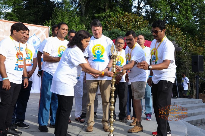 Consul General of India, Hon. Dr. Swati Kulkarni, Consul Shailesh Lakhtakia, Sandy Springs Mayor Rusty Paul, Dir. General Vincent Liu (Taipei Economic and Cultural Office) and his wife Gloria Chiao graced and inaugurated the event. After the traditional lighting of the diya (lamp) by Dr. Kulkarni, Mayor Rusty Paul, Consul Shailesh Lakhtakia, and core committee team members, founding member of idyatlanta.org, Ajay Houde warmly welcomed all. “Today is the 5th International Day of Yoga. It is being celebrated all over the world, and as India’s Prime Minister Modi ji said, it has become a movement for promoting health, harmony, and peace.”