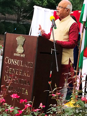 Dr. Vinay Sahasrabuddhe was dressed in the traditional Indian attire of a white salwar with a red kameez and a beige vest, matching the big flowers that were bound on the garlands that were placed on the bust. He spoke of the warmth that he received on his visit to Atlanta and was humbled to be unveiling the Gandhi statue in Atlanta, the land of Dr. King. He asked all to continue embracing Gandhi’s teachings and allow for the message of Gandhi-King advocacy of nonviolence and freedom for all to influence the world at large. He noted, for example, that Gandhi’s idea of noncooperation taught us to sit or to undertake a fast to register a protest—these are nonviolent instruments, he said. He also noted that Prime Minister Modi has given a clarion call for garbage and uncleanliness to Quit India, corruption, caste, and communal politics to Quit India, poverty and terrorism to Quit India—and that all of us must come together against them.