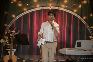 Humorous emceeing by young Hersh Mathur (left) delighted the audience. (Photo: Yogesh Goswami)