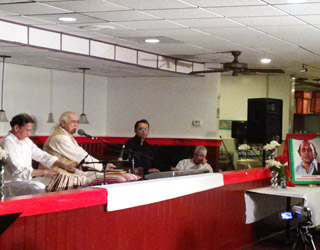 The program began at 9:15pm with salute to Khan Sahib's picture ornamented with a red scarf around it, and a warm welcome by Sunny Thakkar. Udai Singh, Atlanta’s music lover and music historian, besides being a notable attorney, painted a moving silhouette of Khan Sahib's sweet personality and engaging humility by narrating and acting his life's incidents, starting with his 1978 visit to his birth village Luna in Rajasthan, India and Khan Sahib’s efforts to raise funds for the development of roads and schools there. Udai Singh continued to expound on Khan Sahib’s magnum persona by describing his vocal training from 6 years of age under strict discipline of his father Azeem Khan, uncle Ismail Khan, and elder brother Pundit Ghulam Qadir (Pandit because he attained a Visarat or PhD in Indian music); his first performance at age 8 for the Raja of Baroda where he sang khayal in raag Basant for forty minutes and became the royal singer; his struggles and success to support his family in Pakistan by starting a tire repair shop and installing tractor diesel engines; and his efforts to get opportunities to sing on Pakistan radio in Lahore, and a few years later in films in Karachi, where he instantly became the most versatile and popular singer of geet and ghazals, earning him rewards in many countries and global fame.