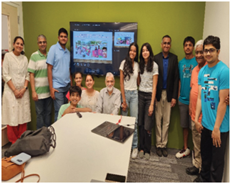 In the first photo, from left to right above are: Ritu Jain (Intern’s mother), Vaisheshi Jalajam (Co-Founder), Amod Sureka (Co-Founder), Sunil Peramanu (Member of Core Planning Group), Shailendra Palvia (Co-Founder) , Intern Swasti Jain in 9th grade, Intern Kavya Turakhia in 9th grade, Intern Simran Ahuja in 10th grade, Intern Agamya Jain in 9th grade, Intern Arnav Jain a College Sophomore, Rajkumari Palvia, Intern Jainik Panchamiya in 12th grade, and Anuj Jain (Intern’s father).