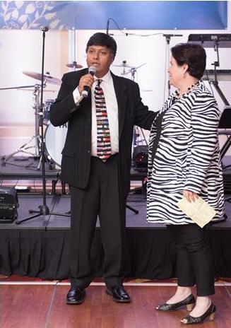(Left) Viren Mayani introduces Alicia Philipp, president of the Atlanta Community Foundation. (Photo: Venkat Kuttua)