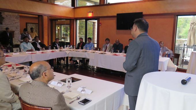 Minister Ganta Srinivas Rao spoke very briefly from his seat. He was happy to see a strong representation of the business and education communities. He thanked the organizer, Sanjay Sehgal of Heartfull and, who is a serial entrepreneur and current CEO of MSys Technologies, for bringing such a passionate group of individuals together. Minister Rao was honored by CEO Madhava Reddy of HTC Global Software from Detroit, along with Sanjay Sehgal, by being draped on the shoulders with a traditional shawl, before the Minister left for a short meeting and to later proceed with his afternoon flight out. Dr. Krishna Linga, CEO of Inphot Inc from New Jersey, draped Nagesh Singh with a shawl to the warm appreciation of the guests.