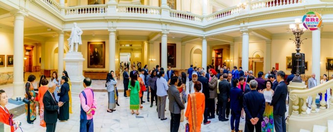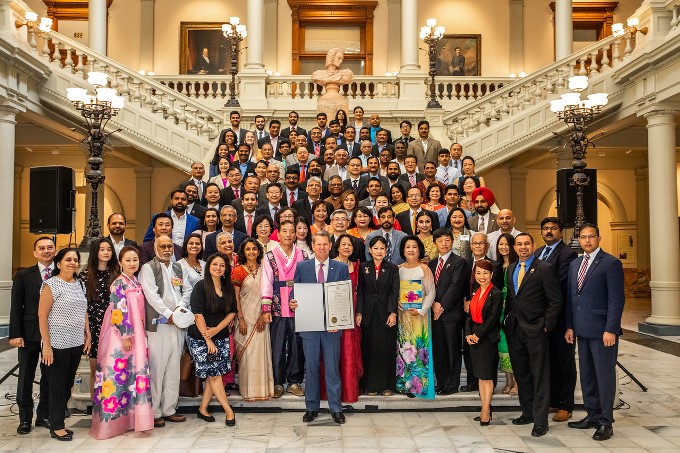 Georgia Governor Brian Kemp met Asian Americans on Wednesday, May 22, 2019 to celebrate May as Asian American Heritage Month. The grand staircase in the north wing of the State Capitol Building was vibrant with smiling faces of people of South Asian and Asian descent who gathered in their traditional clothes and jewelry to share their heritage and culture. Fatherlands were well represented: Consul General of Japan, Takashi Shinozuka; Johns Creek City Council member Jay Lin; Varinee Sangmalee from Bankok, President of TAWC USA (Thai Association World Center), ACE, & TACC, and Communication Director at Asian Pacific American Council of GA (APAC); and people from Korea, India, and other countries participated in this event.