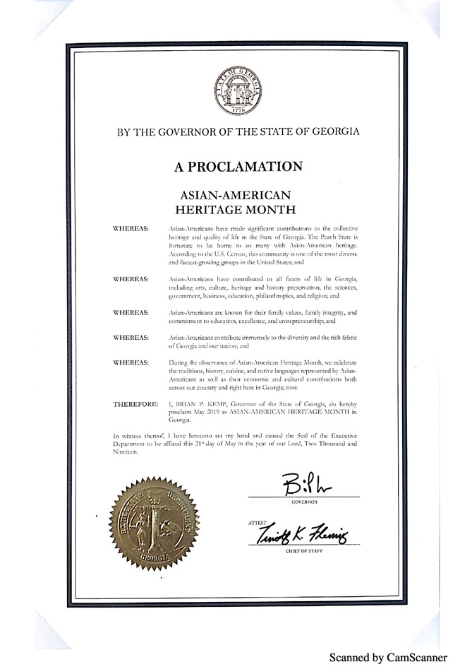 Georgia’s Governor Kemp proclaimed May as Asian-Pacific American Heritage Month (APA) on March 28, 2019, and also proclaimed May as Asian-American Heritage Month (AA) on May 21, 2019.
