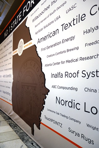 On the side of the great staircase, where Governor Deal came out to meet the gathering, receive issues of the various publications, and pose for a photo, a huge banner of businesses in Georgia included one business that was recognizably Asian American: Surya Rugs. Suniva, and how many others, did not seem to be there.