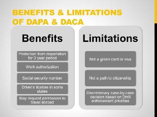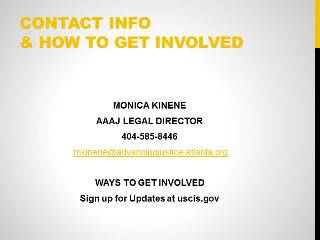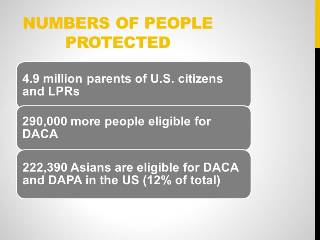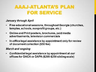Several presentations on these issues were organized recently (Jan 22, Feb 10) by Helen Ho, Executive Director of Asian Americans Advancing Justice – Atlanta (formerly Asian American Legal Advocacy Center), whose mission encompasses economic justice, education, health, immigration, and voting and civic participation. The organization is working to educate the community through free educational sessions at churches, temples, schools, nonprofit groups, etc., and to assist individuals applying for DACA or DAPA through in-office legal assistance by appointment. Monica Kinene, AAAJ Legal Director may be reached at 404-585-8446. Sonjui Kumar is Board Chair. Their powerpoint presentation is shared below.