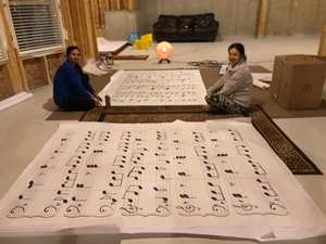A beautiful setting was made for Ma Saraswati, the bestower of knowledge, music, and art. Dressed in white for purity, she stood on the lotus, which, untouched by the muddy waters in which it grows, symbolizes the need to remain untouched by negative influences which may surround us. Her right hand was in a gesture of blessing, and she held her veena in her left hand. On her left were a small ink bottle and a book; on her right was the hamsa or swan (her vehicle representing beauty and also discernment, since the swan is said to be able to separate milk from water with its beak, symbolizing the need for individuals to always discern between right and wrong). A beautiful new backdrop made for the 2018 celebration represented a music notebook and, together with a huge red inkpot with feather pen, created an ambience befitting Ma Saraswati—and also reflected the dedication of the decoration committee to continuing their culture through art.