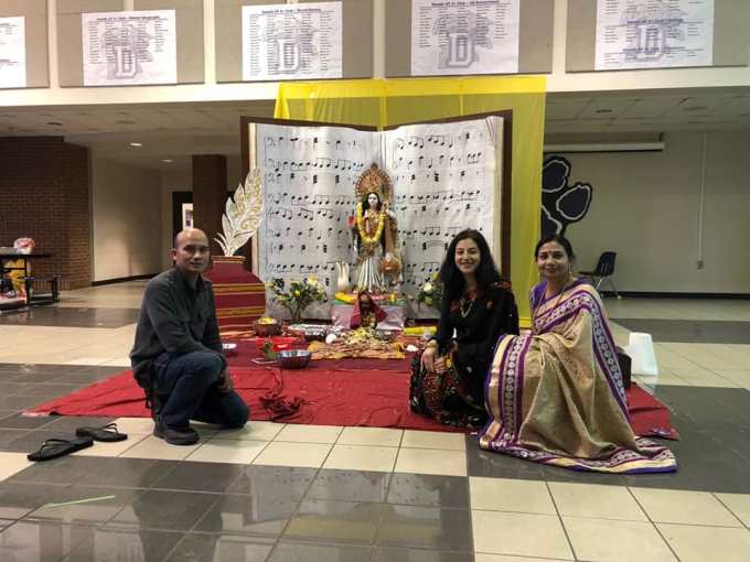 While nature was showering rain around Atlanta on Saturday, January 27, 2018, members of Bengali Association of Greater Atlanta (BAGA) were offering flowers of devotion and love to Ma Saraswati, Goddess of Knowledge, at Duluth High School in Duluth, Georgia. The all-day event was organized to celebrate Basant Panchmi, the fifth day of Spring, a day of festivity celebrated in different parts of India as a new beginning. On this day especially, Ma Saraswati is worshipped, and blessings are invoked for children who are initiated into writing and learning.