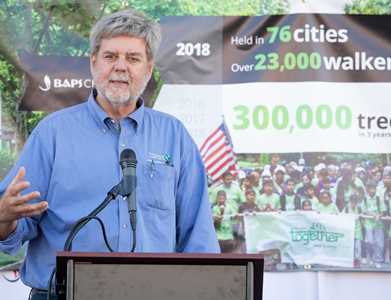 (Left) Chris Topik, Director of Plant a Billion Trees at The Nature Conservancy, speaking on the occasion of receiving BAPS Charities' donation, raised through the Walk Green events in Atlanta and around the country.