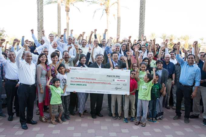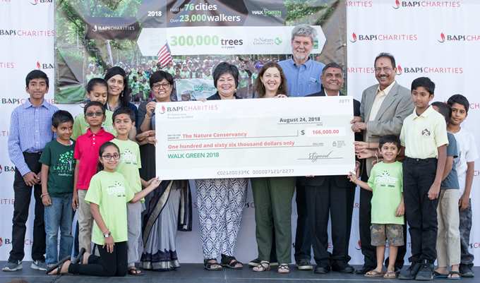 BAPS Charities celebrated a three-year partnership with The Nature Conservancy (TNC) through its Walk Green initiative, a series of walkathons hosted by BAPS Charities across North America. Beginning in 2016, BAPS Charities coordinated efforts with TNC to raise funds for the Plant a Billion Trees initiative, and on August 24, 2018, presented the final gift of $166,000 to TNC executives and program leadership in Chino Hills, California. BAPS Charities volunteers and donors provided a total of 300,000 trees to TNC, made possible by $431,000 in total funds raised over three years by 23,000 walkers at 76 cities across the nation. TNC staff and leaders attended several of these walks, educating walkers about the importance of environmental protection and the urgent need for all people to become active stewards of the environment.