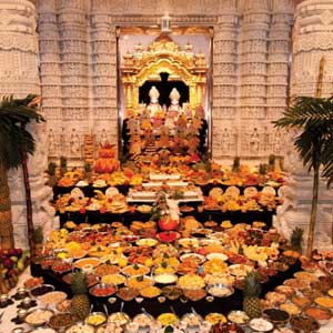 Hues of blue, green and yellow illuminated the BAPS Shri Swaminarayan Mandir in Lilburn as thousands of Hindus came together to celebrate Diwali, the Festival of Lights, on October 26, 2011. The Mandir steps were lit with hundreds of candles, and fireworks filled the night sky with beautiful colors against the backdrop of the majestic marble structure. In front of the reflecting pond, families congregated to exchange joyous wishes and share in the celebration. They stood around a rangoli, a beautiful floor design made with colored rice and powder. The next morning marked the culmination of this five-day festival with the celebration of annakut and the Hindu New Year. While Diwali celebrates the triumph of good over evil and reminds us to dispel our inner darkness with the light of God’s presence, the New Year is a time of renewal, reflection and resolution. It is also an occasion for thanksgiving, and is traditionally celebrated with annakut (‘a mountain of food’), with thousands of homemade vegetarian food items offered to God and laid out in an elaborate, decorative display.
