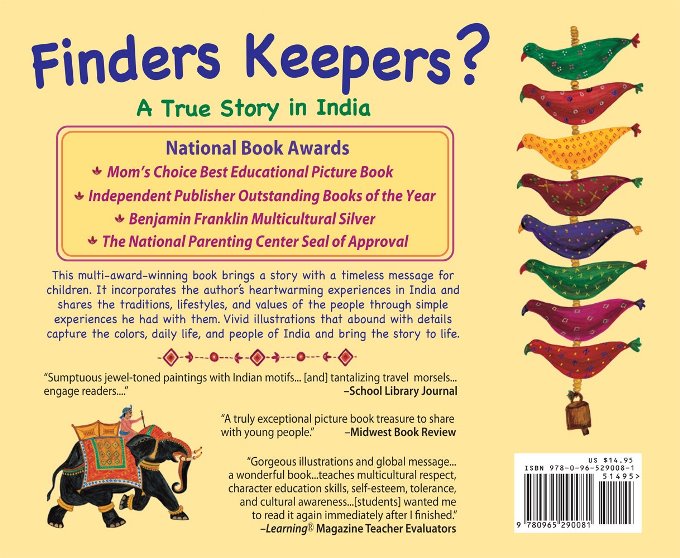Back cover of Robert Arnett's children's book, Finders Keepers?: a True Story in India.