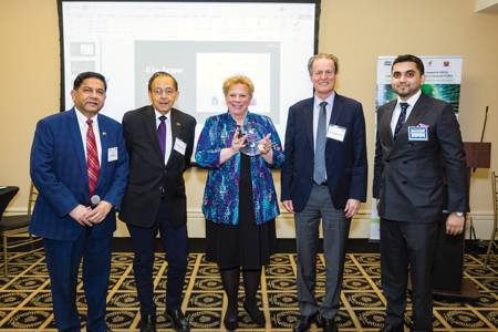 [Left] Event Co-Chairs Dr. John McIntyre (2nd from left) and Ani Agnihotri (far right) with participants