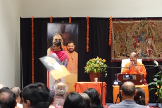 Pujya Swamiji heartily congratulated the sincere and consistent efforts of CMA members, blessed the ashram, aptly naming the enchanting, beautiful idol of Lord Krishna as ‘Sundar Krishna’ and bestowed the quote “Krishnam Vande Jagagurum” for the ashram. The plaque wordings composed by Pujya Swamiji express the vision & purpose of the ashram as follows: May this Chinmaya Mission center always shine victoriously; May there be study and teaching of the Vedas and Vedanta here. May all members worship God with devotion, and may the beautiful spirit of karma yoga be in the hearts of all.