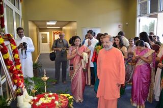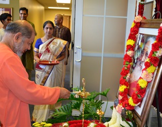 On the 22nd of July 2015, H.H. Swami Tejomayananda, head of Chinmaya Mission worldwide visited the the new ashram. CMA volunteers welcomed Pujya Swamiji, lining up outside the main door with Om lamps and flowers. Pujya Swamiji lit the lamps for Pujya Swami Chinmayananda and formally inaugurated a glass monument plaque at the entrance. He was escorted by CMA youth to the altar, where a special archana was performed.
