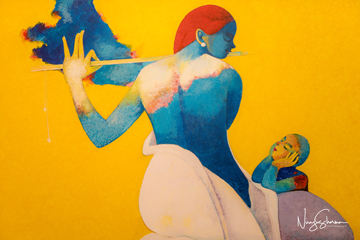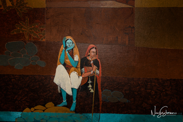 Deriving much inspiration from the natural beauty of Rajasthan and its people, the artist takes us on a journey through the villages and deserts of this princely state. We discover this region in his depictions of its tribal folks, bright clothing, jewelry, and nomadic lifestyle. The architectural flavor of various cities like Udaipur, Bikaner, and Jaipur can be seen in the background of his many creations.