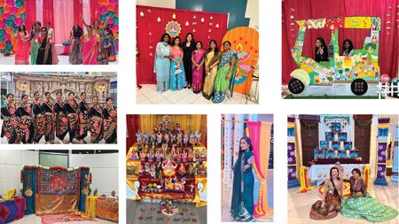 The decor, coordinated by Synthia Padala, evoked festive and Diwali vibes, while also showcasing the rich cultural tapestry of India: glowing diyas, colorful marigolds, rangolis made with flowers, handcrafted recreations of South Indian temple pillars, golus of many deities, hand-painted illustrations from the Ramayana, and a backdrop of the Konark Chakra, a symbol of Odisha’s rich heritage. An aarti welcoming Goddess Lakshmi created an auspicious environment.