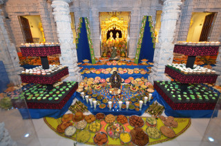 One of the unique aspects of celebrating the New Year is offering a feast of food items called annakut, meaning “a mountain of food.” The devotees of the Mandir worked tirelessly for many weeks to prepare this colorful array of vegetarian food items to be offered to Bhagwan.