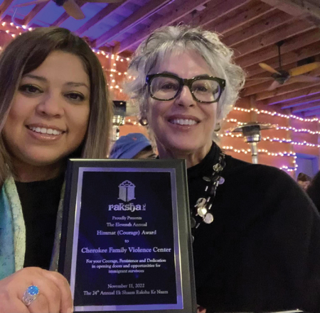 The Himmat Award was next presented to one of Raksha’s community partners, Cherokee Family Violence Center (CFVC). Even before they created their Multicultural Services Program and took on the Spanish-speaking domestic violence hotline, CFVC has been a strong advocate for immigrant survivors, especially when their