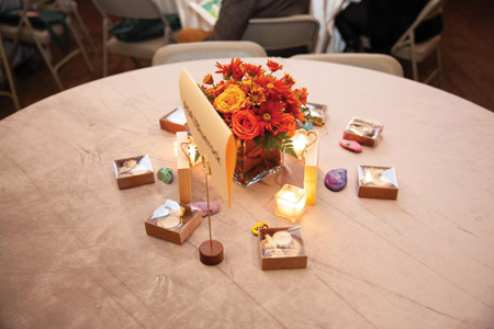 The décor was curated by Sangeeta Sheth, Tina Thapar, and Raunak Mercent. This included the keepsake inspiration rocks and tea light candles for attendees, many of which were painted by community volunteers from Raksha, Raksha Youth, and WOW (Women for Women). Floral arrangements and candle centerpieces were donated by Designs by Her. The food was donated by Naanstop and the dessert was donated by Chef Dinesh Café.