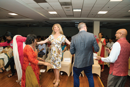 Ajay Upadhyaya kicked off the music- and songs-studded program. The Sur Sangam group seamlessly wove through vintage, semi-classical, and trending new songs “O duniya ke rakhwaale.” “Parda hai parda,” “Lag ja gale,” “Julie, I love you,” and “Dhum dhum dhol baaje” among other soulful and foot-tapping numbers. The romantic song “Badan pe sitaare lapete hue” appealed to Shawn Still and his wife so much that they couldn’t resist getting up to sway and dance to this catchy number!