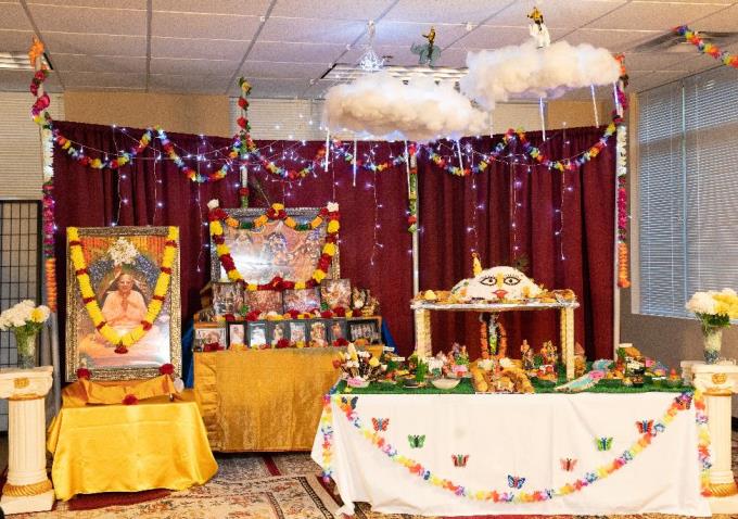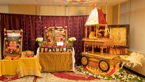 (Left) A mini chariot with Krishna and Arjuna was set up beside the altar.