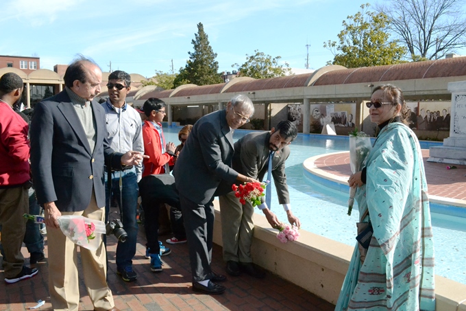 Urdu poet Sadaf and her husband Azhar Farooqui also garlanded the statue. (Photo: Ravi Ponangi) |