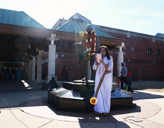 Following the floral homage to Gandhiji at the statue, Shardaben Patel led the singing of Gandhi’s favorite bhajans “Raghupati Raghav” and “Vaishanava Janato.”