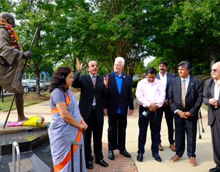 Once the initial meet and greet was complete, Dr. Swati Kulkarni, Consul General of India in Atlanta, led the guests to the bust and laid a garland on the statue. The guests followed her to garland and shower flower petals on the statue to pay homage to one of the world’s greatest apostles of peace.