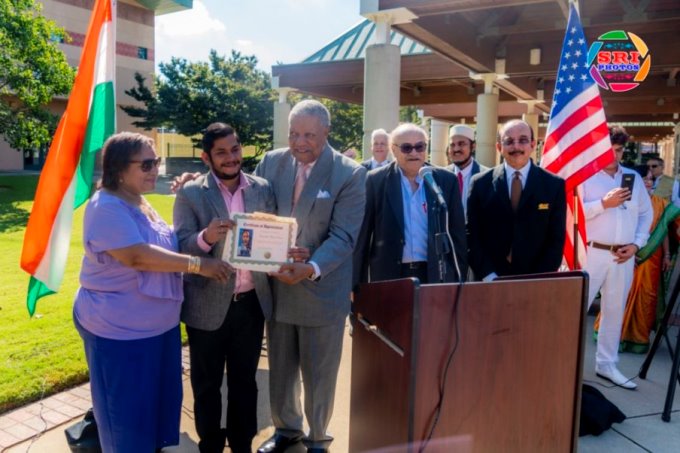 (Right) Pedro Marin presents the Governor’s Proclamation to Dr. Kulkarni. (Photo: Suresh K. Volam, Sri Photos)