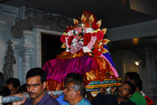 Deities in the Balaji and Siva Temples also wore a dazzling look in their ornate fineries and colorful garlands. The priests cheerfully performed archanas throughout the day blessing all devotees who came to offer prayers. In the Balaji Temple 40 shanku sthapana (conch shells) puja was done and the conches were attractively displayed for viewing and prayers. Ganesh Chaturthi was also celebrated by children inside the Temple and many devotees observed Ganesh Vratha. In the evening, during prakara utsavam, Ganesh murti was carried by devotees in a procession around the Temple to accompaniment of drums, musical instruments, chanting, and singing by supporters. This was followed with arathi and theerdha prasadam.