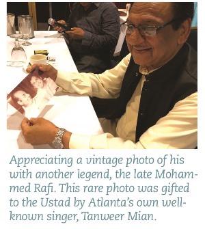 An extremely interesting Q&A followed. Atlanta’s Tanweer Mian gifted a rare photo of Ghulam Ali with Mohammed Rafi, which Ustad Ghulam Ali greatly appreciated, especially since Rafi saab’s death anniversary was July 31. Mustafa Ajmeri, too, recalled hosting the maestro several years ago in Chicago, which Ustad Ghulam Ali remembered quite distinctly.