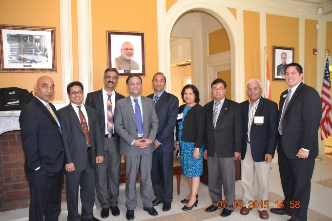Govind Hariharan, Jay Kalke, R. Srinivasan (Deputy Counsel General), Nagesh Singh (Counsel General of India in Atlanta), Raj Forar, Sonjui Kumar, Ash Thakker, Siva Nathan, Ric Hubler. GIACC Board Members hosted a lunch for the delegation on July 7, 2015 at the Consulate.