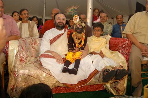 The main event of ground breaking rites was conducted by Pujyahsree H D H Shashtpeethadishwar Goswami 108 Shree Dwarkesh-lalji Maharajshree accompanied by priests from India. Consul General Ajit Kumar, chief guest, congratulated the Gokuldham team. More than 100 vaishnavs per- formed bhoomi pooja together in the morning and purshottam yagna in the afternoon, chanting the vedic mantras together. Even the kids enjoyed the spiritual experience of chanting “Om Swaha.”