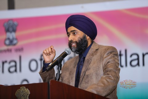 (Left) Consul Lakhtaki speaking at the celebration of Guru Nanak’s 550th birth anniversary. (Photos: SFA Productions)