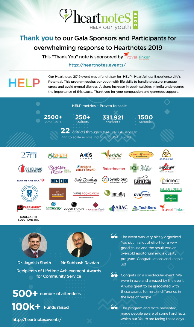 The Heartfulness Institute (a nonprofit focused on Meditation and Wellness) has developed programs to help youth cope with mental health issues, a global crisis coming from stress, mental fatigue, and competition, resulting in a record number of recent deaths by suicide. HeartNotes 2019 fundraising gala at the Signature Ballroom, in Suwanee, GA, on June 2, 2019 was graced by over 500 attendees and Bollywood actors Omi Vaidya and Radhika Apte. The title sponsor was 27th Investments, and the funds raised approximated $100K!
