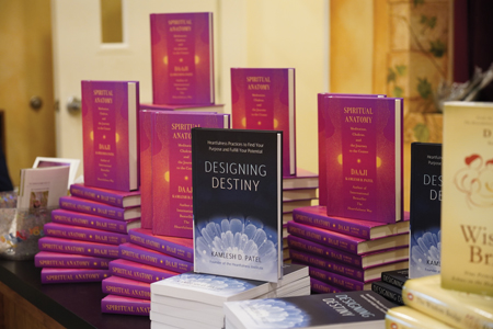[Left] Daaji’s book, Designing Destiny, on display at his meditation sessions and presentations in the city.