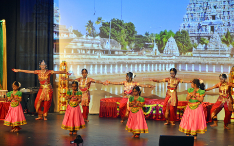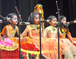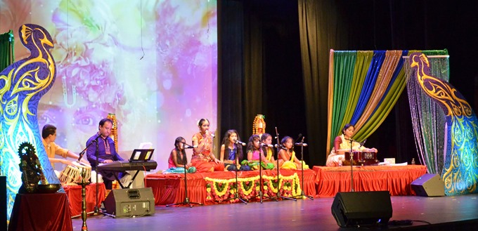 About 100 students performed that afternoon. The opening segment began with Hindustani and Carnatic vocalists performing a shloka for peace from the Upanishads, with a high vibration. The second performance was by Bharatnatyam students who presented the dance form Shiva stuthi, a prayer and offering to the Lord of dance, that breathes sophistication and grace. The third performance was by Bollywood dancers on a song from the movie Bajirao Mastani.