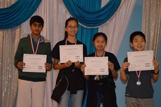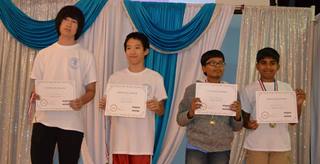 (Right) 1st Place Team: South Forsyth Middle School - Cory Melton, Daniel Shen (also 1st Place Individual winner), Nitin Bolakond, and Aadi Karthik (also 4th Place Individual).