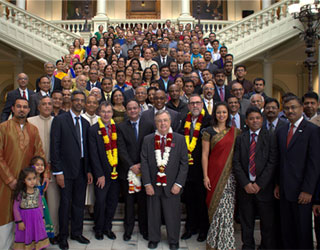 GA Public Service Commissioner Tim Echols welcomed all to the Capitol and urged Indian community members to come back in January to March to meet lawmakers and build relationships. “I have learnt that relations matter if you want to advance agenda of your community, if you want to increase your importance, and want your voice to be heard. I want to tell you about the Great Seal of the State of GA. It is on my name tag, it is on the flag, and on every door handle in this building. The three words of the official state motto are, Wisdom, Justice and Moderation. And as we celebrate this Festival of Light and as we think of driving darkness from ourselves, from our neighborhood, from our State, I think of the importance of training our children in understanding wisdom, justice, moderation. There is so much we can do in Atlanta. ... Well, I stand at your service, if I can help the community continue to grow, continue to have influence. I thank you for your friendship with me. Our Governor is out of state today. We thank you for the many contributions you are making across many businesses, many organizations, in your own homes and schools with your children.”
