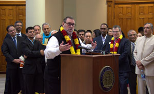Guests began arriving around eleven a.m. and after cheerfully exchanging greetings, stood admiring the colorful rangoli and artistic and decorative miniature annakut elegantly set up at the foot of the staircase in the south wing of the Capitol, and posed for photographs. After the cordial meet and greet session, at noon Mitesh Patel and Ritesh Desai warmly welcomed all and expressed their Happy Diwali and New Year wishes. They introduced and recognized the dignitary speakers and began the program with Shanti Mantras for world peace recited by BAPS youth.