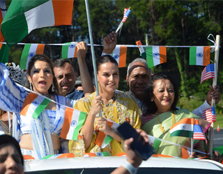 [Left] Bollywood actor Neha Dhupia and IACA team led the 300-foot-long Flag Walk at the 27th Festival of India.