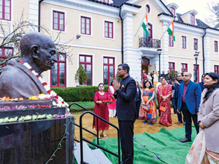 On January 26, 2024, the Indian Consulate in Atlanta arranged for the ceremonial flag hoisting on the Consulate’s green lawns. With Consul General Ramesh Babu Lakshmanan, his wife Renuga Devi, and other guests, the observance began with a prayer and floral offering at the bust of Mahatma Gandhiinstalled in the Consulate lawns. This was followed by the unfurling of the Indian Flag which showered rose petals as it fluttered. In a unanimous voice, all sang the Indian National Anthemwith pride and passion. Chants of Vande Mataram and Bharat Mata Ki Jai resounded in the air.