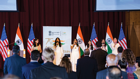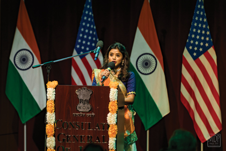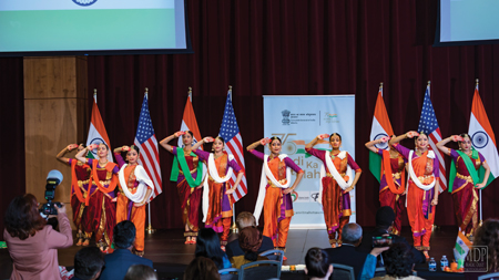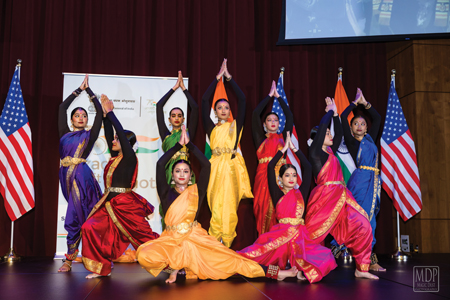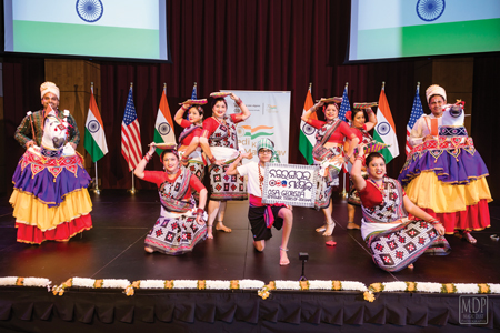 The cultural performances began with the students of the Deeksha School of Performing Arts opening with “Mool Mantra,” followed by a crisp Bharatanatyam Jathi to the beautiful composition of Guru Saroja Vaidyanathan and concluded with the Bengali composition“Jaya He” depicting the beautiful meaning and essence of the Indian national anthem. The dance was choreographed by Anupa Thakurta.