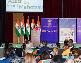 During this networking session, the video screens on either side of the stage ran a video clip of the Honorable S. Jaishankar, Minister of External Affairs, India, as he spoke of the significance of the 75th Indian Independence Day. Soon after,Asim Kumar,the Head of Chancellery at the Consulate, brought the house to order, requesting everyone to take their seats and settle down. He introduced the Honorable Consul General Dr. Swati Kulkarni and requested her to approach the podium and bring her remarks.